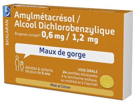 AMYLMETACRESOL/ALCOOL DICHLOROBENZYLIQUE BIOGARAN CONSEIL 0,6 mg/1,2 mg MIEL ET CITRON, pastille édulcorée à la saccharine sodique, au maltitol et à l'isomalt