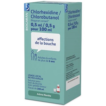 CHLORHEXIDINE/CHLOROBUTANOL BIOGARAN CONSEIL 0,5 ml/0,5 g pour 100 ml, solution pour bain de bouche en flacon