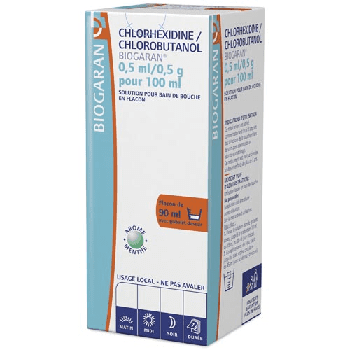 CHLORHEXIDINE/CHLOROBUTANOL BIOGARAN 0,5 ml/0,5 g pour 100 ml, solution pour bain de bouche en flacon